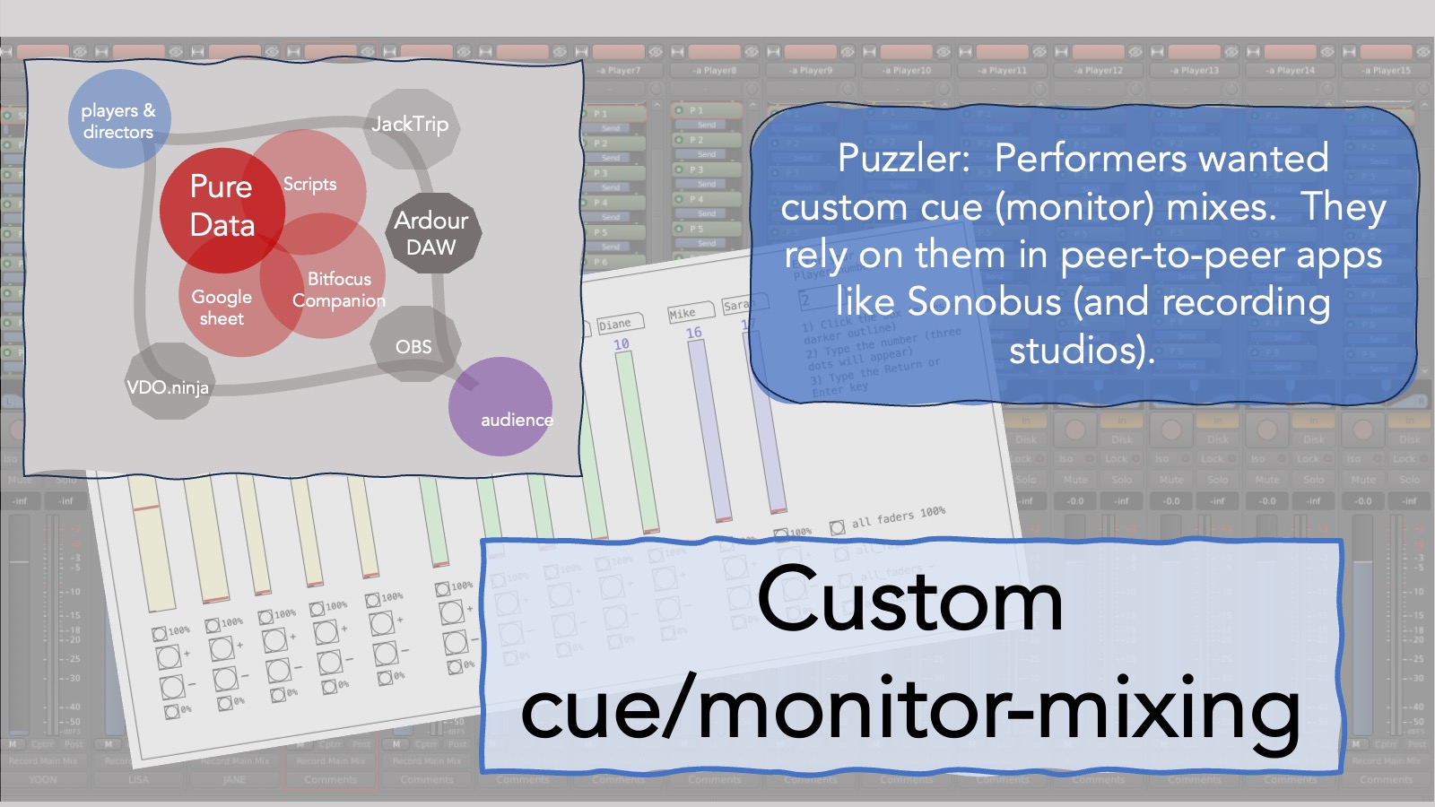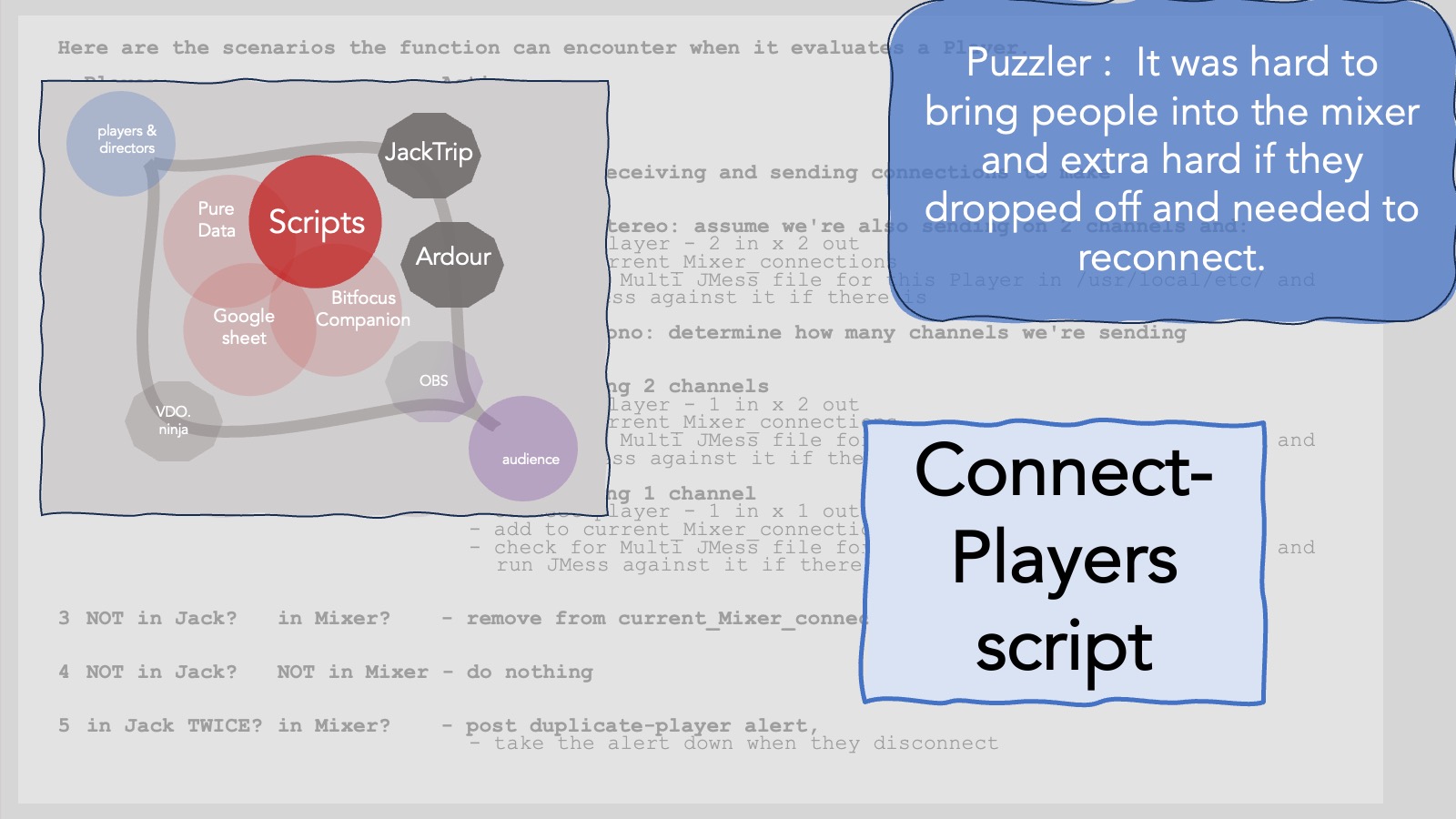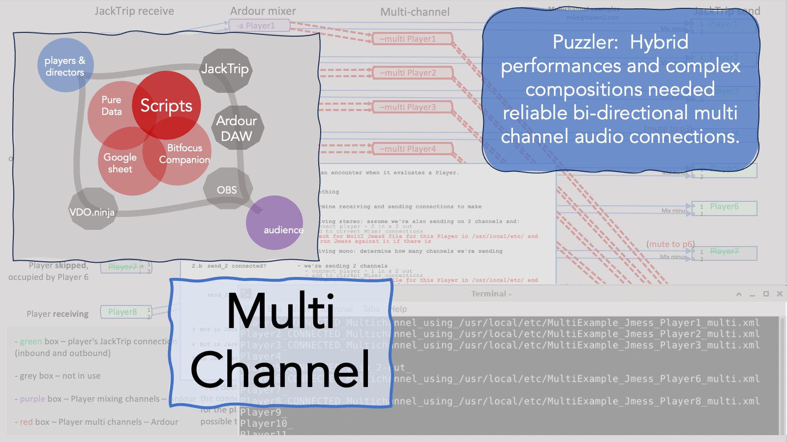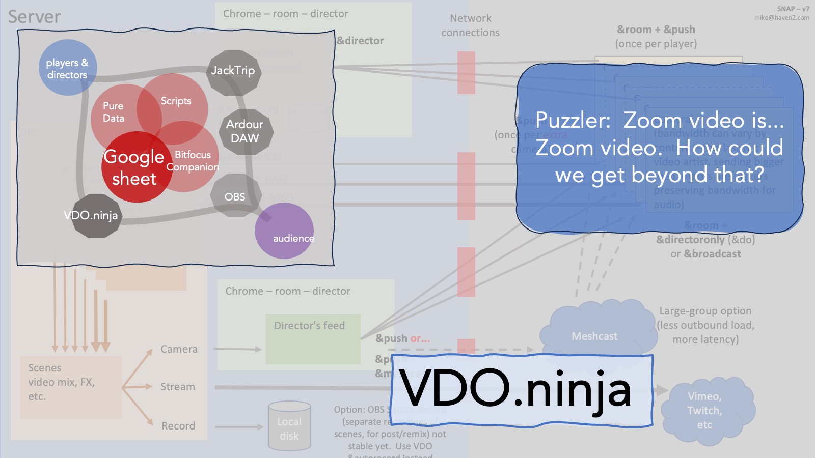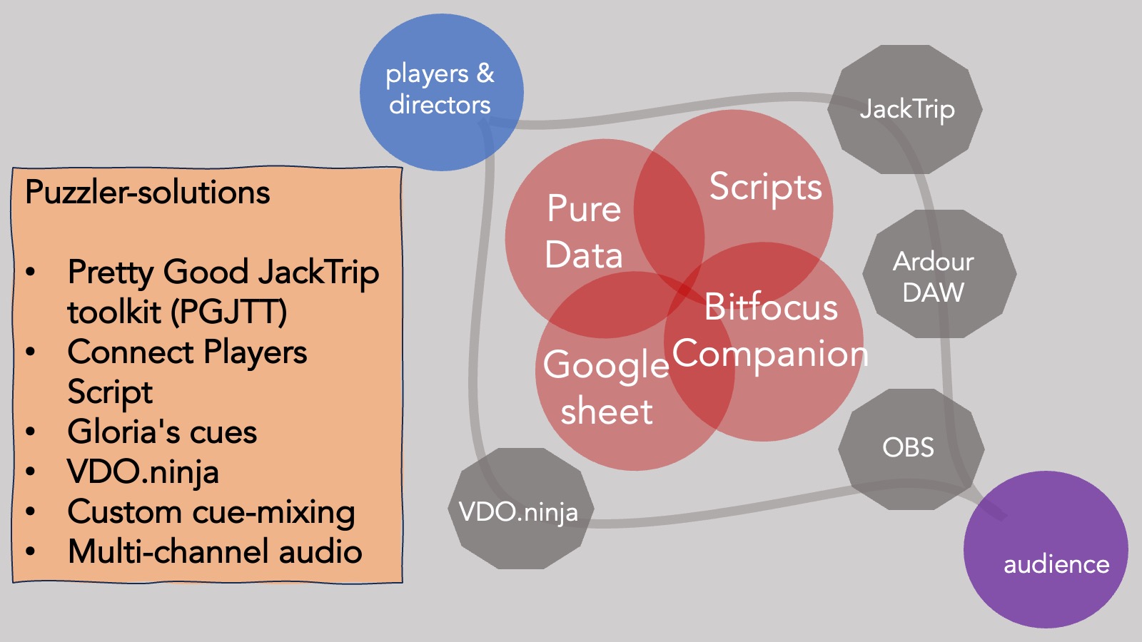 Here’s the intro which shows the paths of audio and video from players to audience, the solutions that get them there and the tools that I used to glue them together.