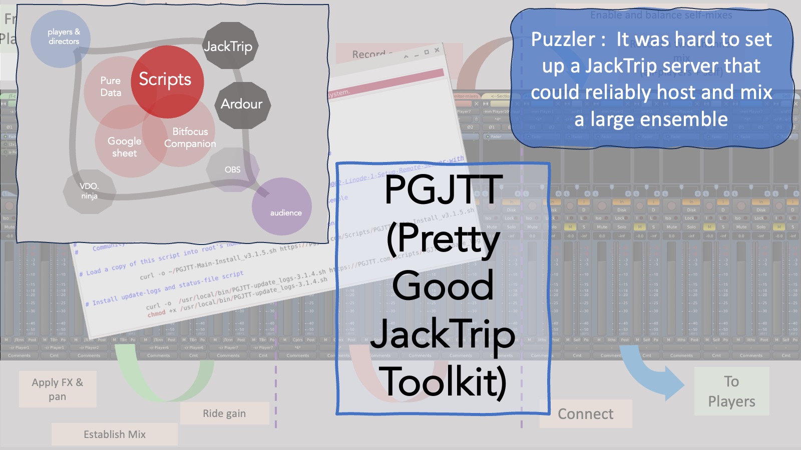 This JackTrip toolkit mushroomed into a much broader integration project toward the end of the Covid era as I ran into a bunch of puzzlers that fell outside the realm or capabilities of JackTrip on its own. Here is an overview of a slide deck that describes them all. You can download the whole deck here – Pictures from an integration V3